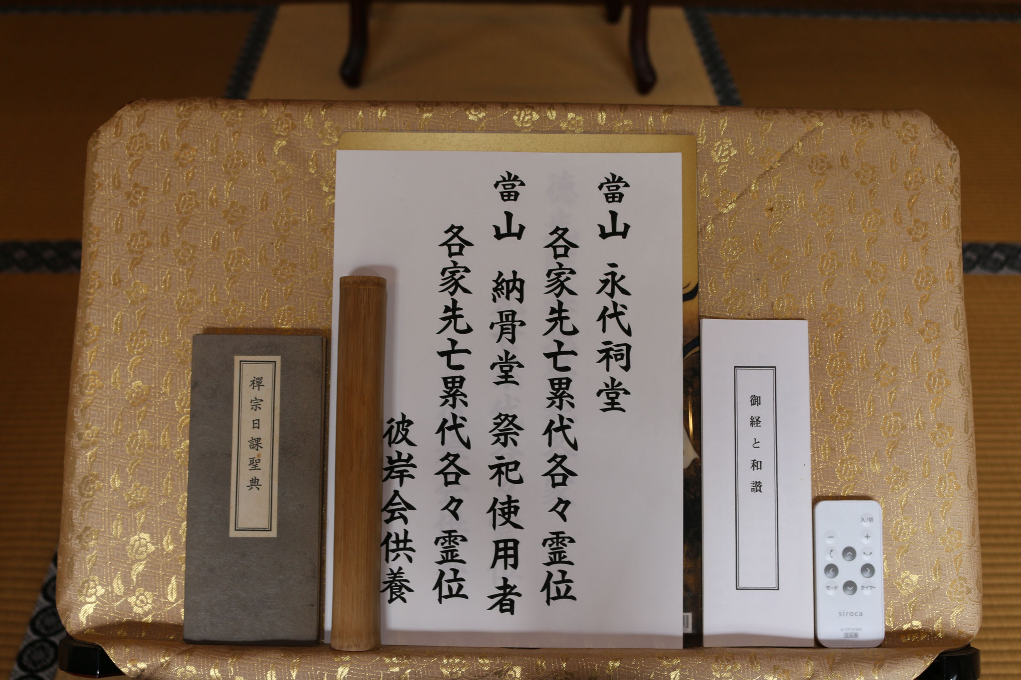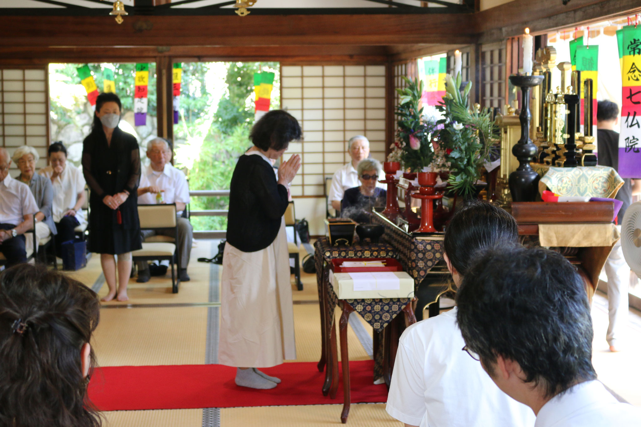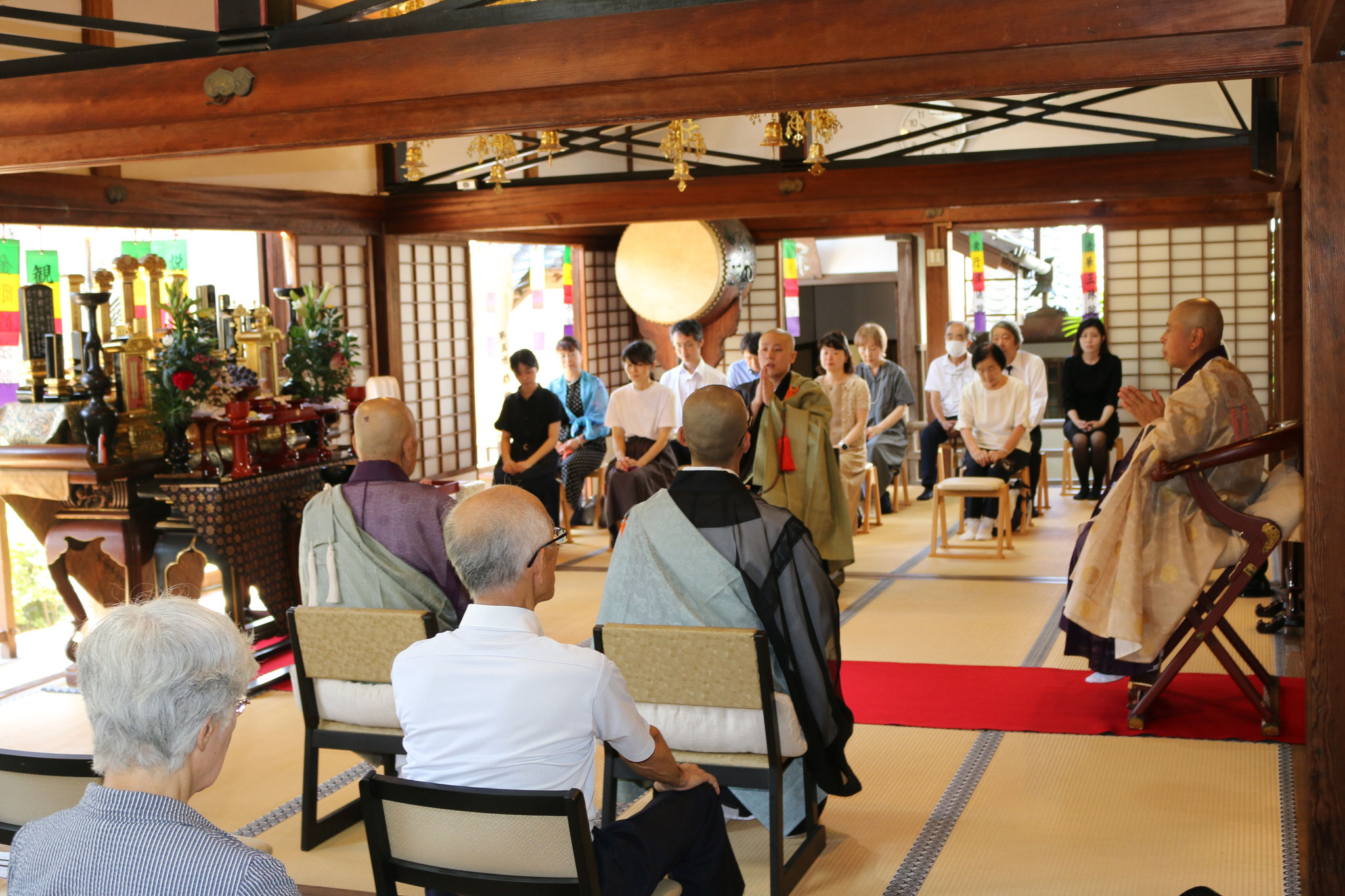 本堂に設けられた精霊棚に向かって静かに手を合わせ、米と水を供えて全員で読経を致しました。