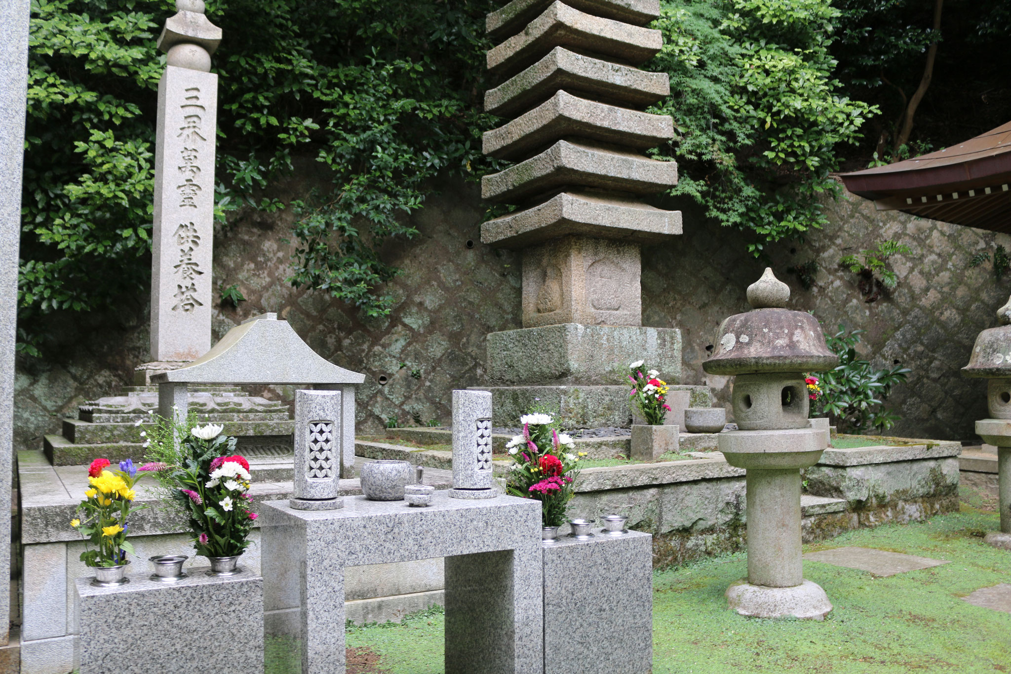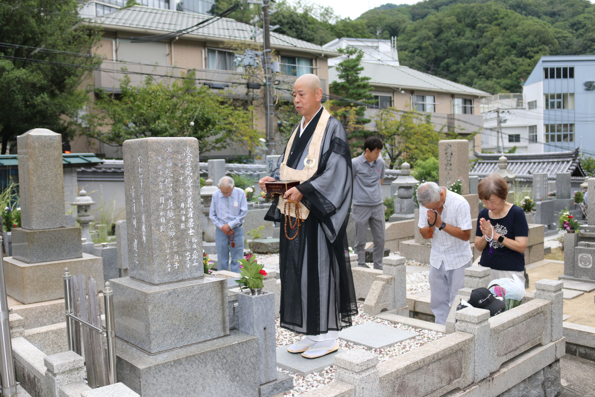 先週から今週にかけ、過去に例がない危険と云われた台風14号が過ぎ去ったのも束の間、引き続き15号が接近し、当日は生憎の降雨となってしまいました。それでも午後2時から行われた本堂の読経回向終了後の墓地巡詣の頃には、幸いに雨上がりとなり、墓苑は多くの参詣者が集い賑わいました。