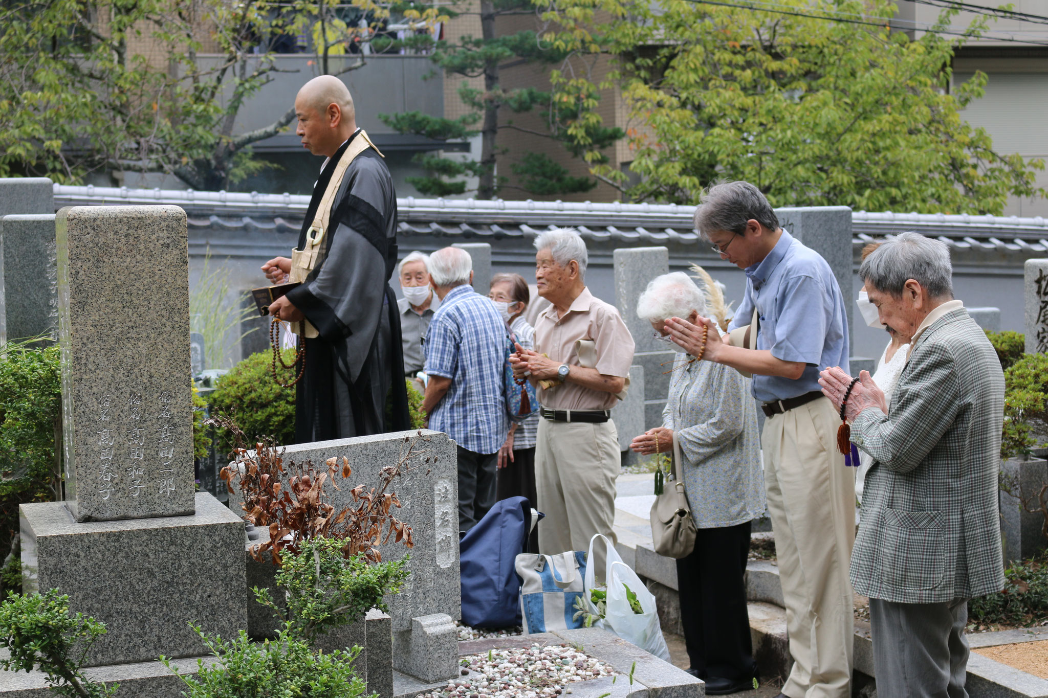墓苑入り口の六地蔵尊から東西に分け二回行う和尚の塋地巡詣を待ち構えるようにして多くの家族ずれで賑いました。その墓参姿には多忙な日常生活から一区切りついたかのような清涼感を感じずにはいられませんでした。墓前に立ち故人の冥福を祈る姿のなかに、終えるとも生きる喜びに満ちた清らかな墓参者の顔付きが垣間見られ、これも伝統行事のお彼岸の素晴らしさではないかと思われるのでした。